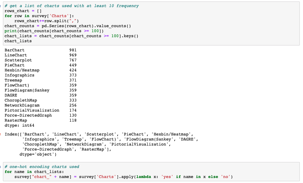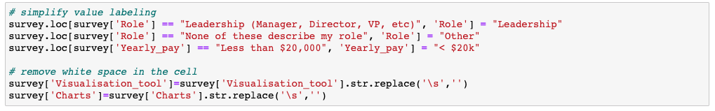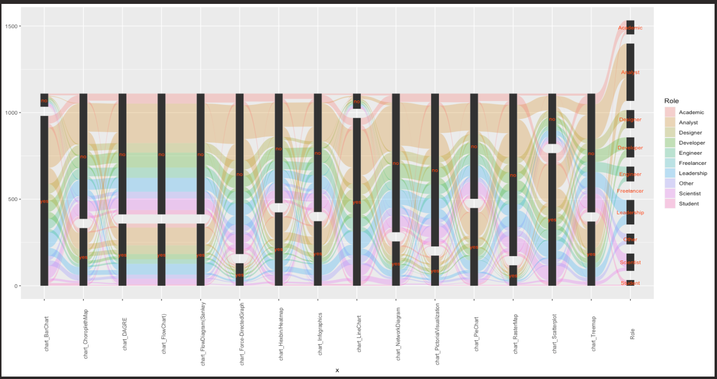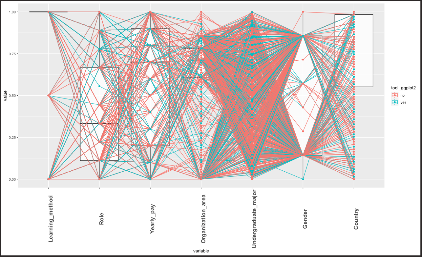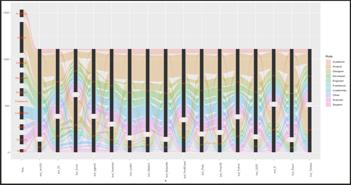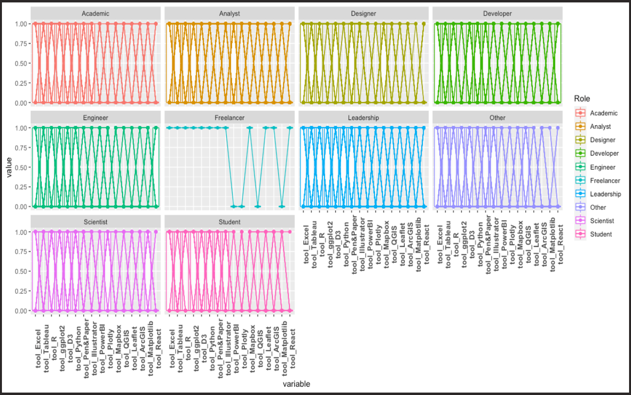Since this is a survey data, columns in the dataset all have categorical variables. It’s not appropriate to use clustering techniques such as dendrogram and k-means clustering method. Therefore, Parallel Set chart, which is compatible with categorical data, is taken into considerations in this case. The width of polylines indicate the frequency of how often each category occur and the width of bar reflects the percentage of each response. The code below is an example of examining the relationship between the usage of different tools and role of respondents.